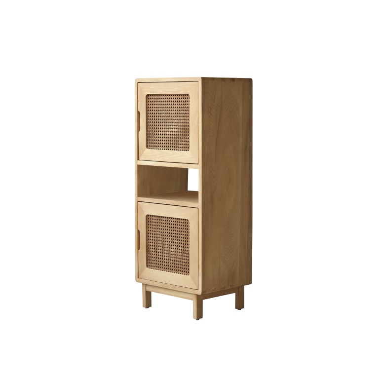 Mobile basso a colonna in legno di olmo massello e rattan