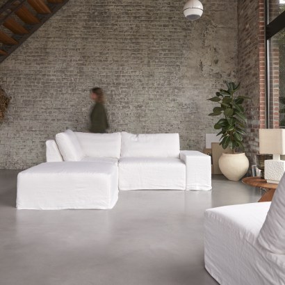 Divano ad angolo modulabile in lino bianco con chaise longue, 2 posti