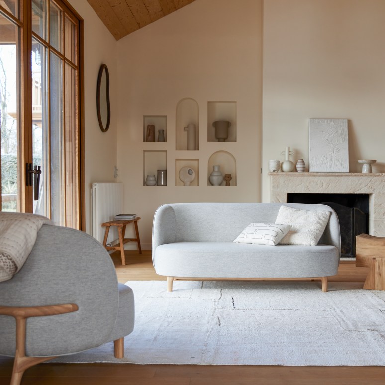 Divano in legno di quercia massello e tessuto grigio, 2 posti