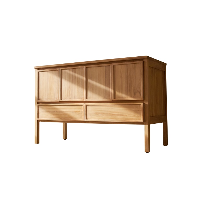Il mobile sottolavabo Jane 120 cm in teak massello porta in bagno un’atmosfera rilassante e accogliente. Con la sua ampia larghezza offre un comfort ideale nell’uso quotidiano ed è perfetto per ambienti famiglia o per un’installazione con doppio lavabo. Il volume generoso aiuta a organizzare lo spazio mantenendo una linea visiva leggera.