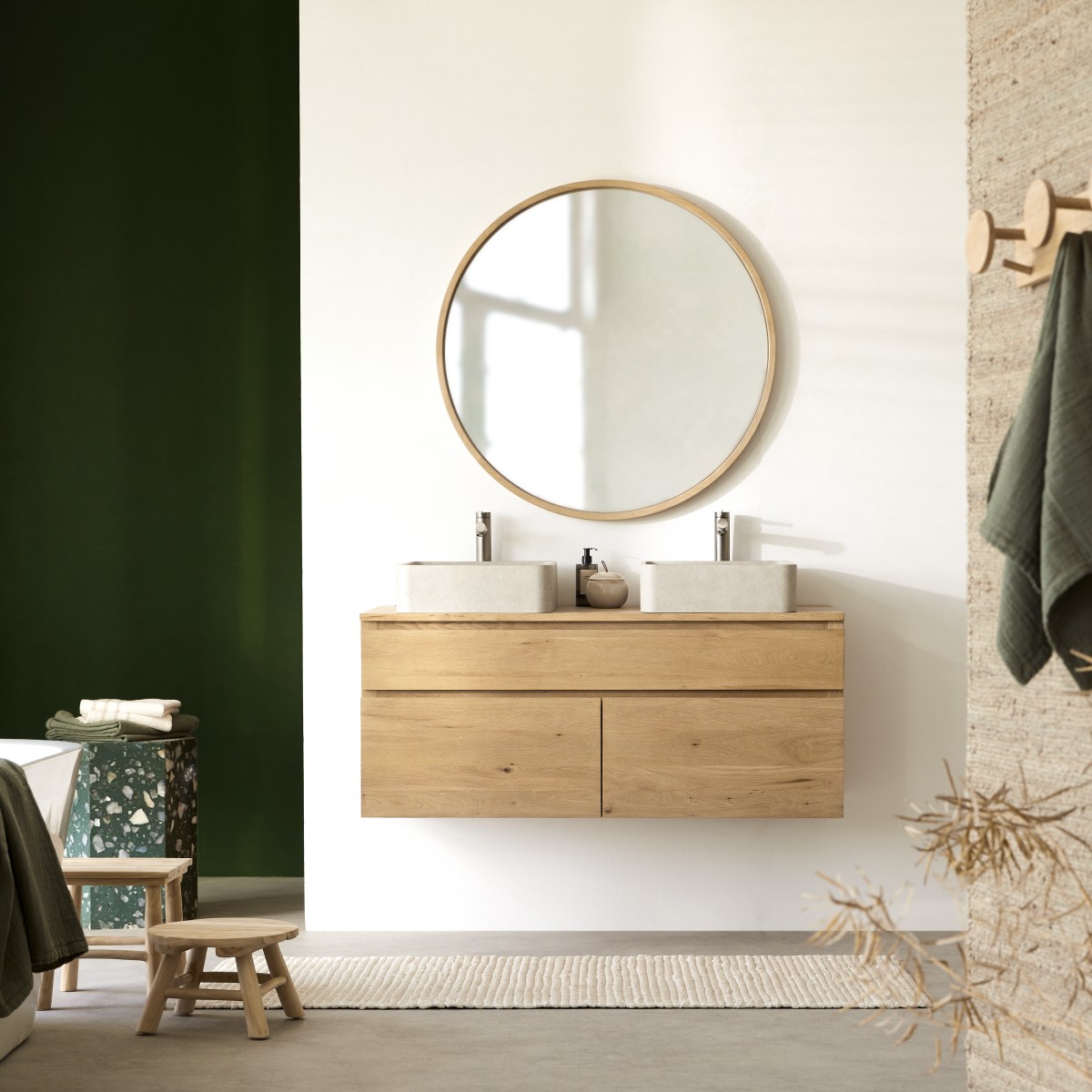 Il mobile sospeso per il bagno in legno di quercia Jacob ha il doppio vantaggio di non occupare spazio sul pavimento (dettaglio pratico, soprattutto per la pulizia) e di essere super capiente: i due cassetti profondi sono pensati per la biancheria da bagno o per i flaconi più ingombranti. Nel cassetto lungo invece troveranno spazio gli asciugamani, le spazzole, i trucchi… non ci sarà più nulla in giro per il bagno!